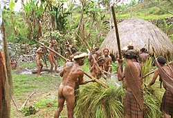 de haren eraf te schrapen met stenen. Een groot vuur wordt gemaakt om stenen