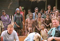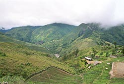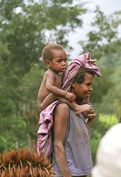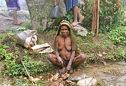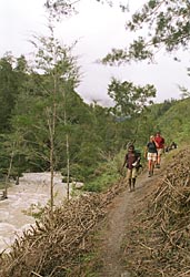 Wij komen nu vlakbij een zijrivier van de baliem rivier. Met 2 anderen van de groep (en gids en dragers) loop ik te ver door naar beneden. Het geroep van de rest horen we nog, maar Ben gebaart dat we zo ook in de goede richting gaan. Even later merken we dat we goed fout zitten. Er moet een zeer steile klim naar boven gemaakt worden, recht omhoog tegen de helling. Op een punt moet ik mij met mijn handen vasthouden aan het gras om niet achterover te gaan. Als over mijn schouders naar achter kijk, zie ik niets. Dit is wel een aansporing om nog snel een stuk verder te klauteren (op handen en voeten).