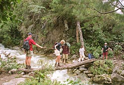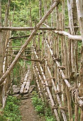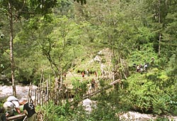 Voorbij het dorp (waar nog snel even pijlen gekocht worden) komen we bij een houten hangbrug over de rivier. De brug moeten we een voor een oversteken. De brug is volledig van hout en is met natuurlijk materiaal samengebonden.