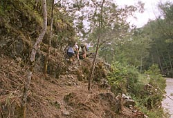 De eigenlijke route gaat vlak langs een afgrond en is blijkbaar bij droog weer al lastig genoeg. De dragers en