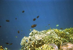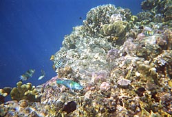 Het koraal is er prachtig. Het gaat eerst geleidelijk omlaag om dan 100 meter steil omlaag te gaan. De 100 meter diepte heb ik maar niet gecontroleerd ;-) Het koraal is erg mooi, maar er zijn ook heel veel kleurrijke vissen te zien. Dit is zeker een van de mooiste plektjes waar ik ooit gesnorkeld heb