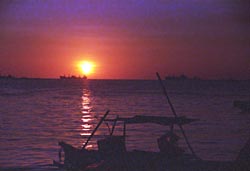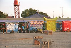 de overkant van de straat is een kleine boulevard met eettentjes. De zon gaat