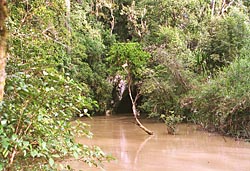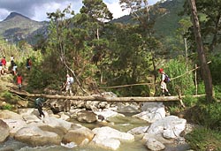 boomstam (deze is gelukkig redelijk breed) de rivier oversteken stoppen we om ons hier te wassen. De toiletspullen