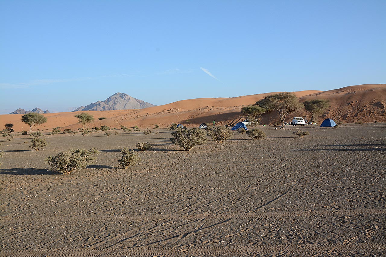 Het is nog een stukje rijden naar de campsite langs een zandduin.