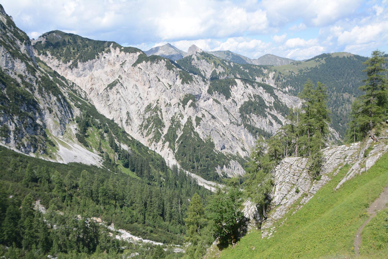 Er volgt een pad door een bos en we dalen snel tot bij een alm (Rohntalalm).