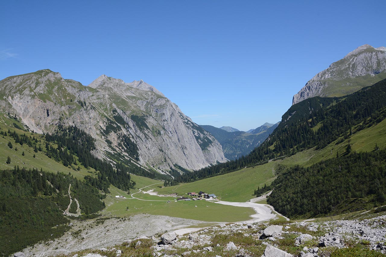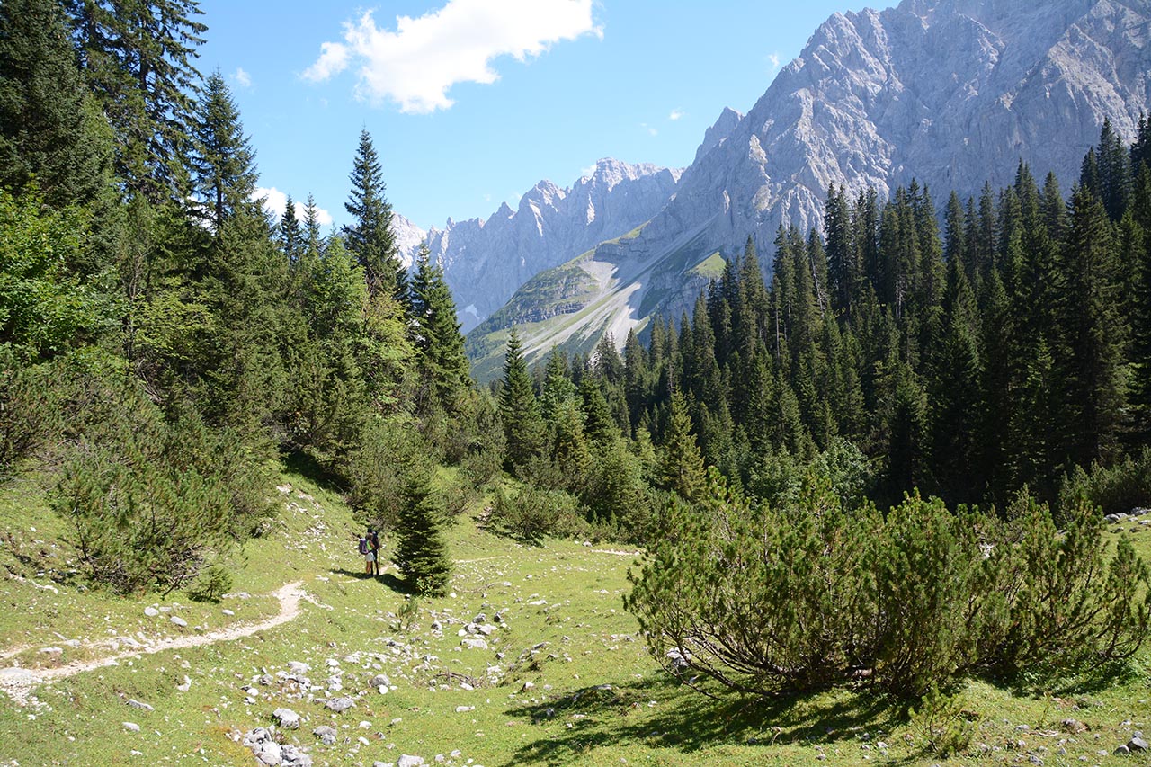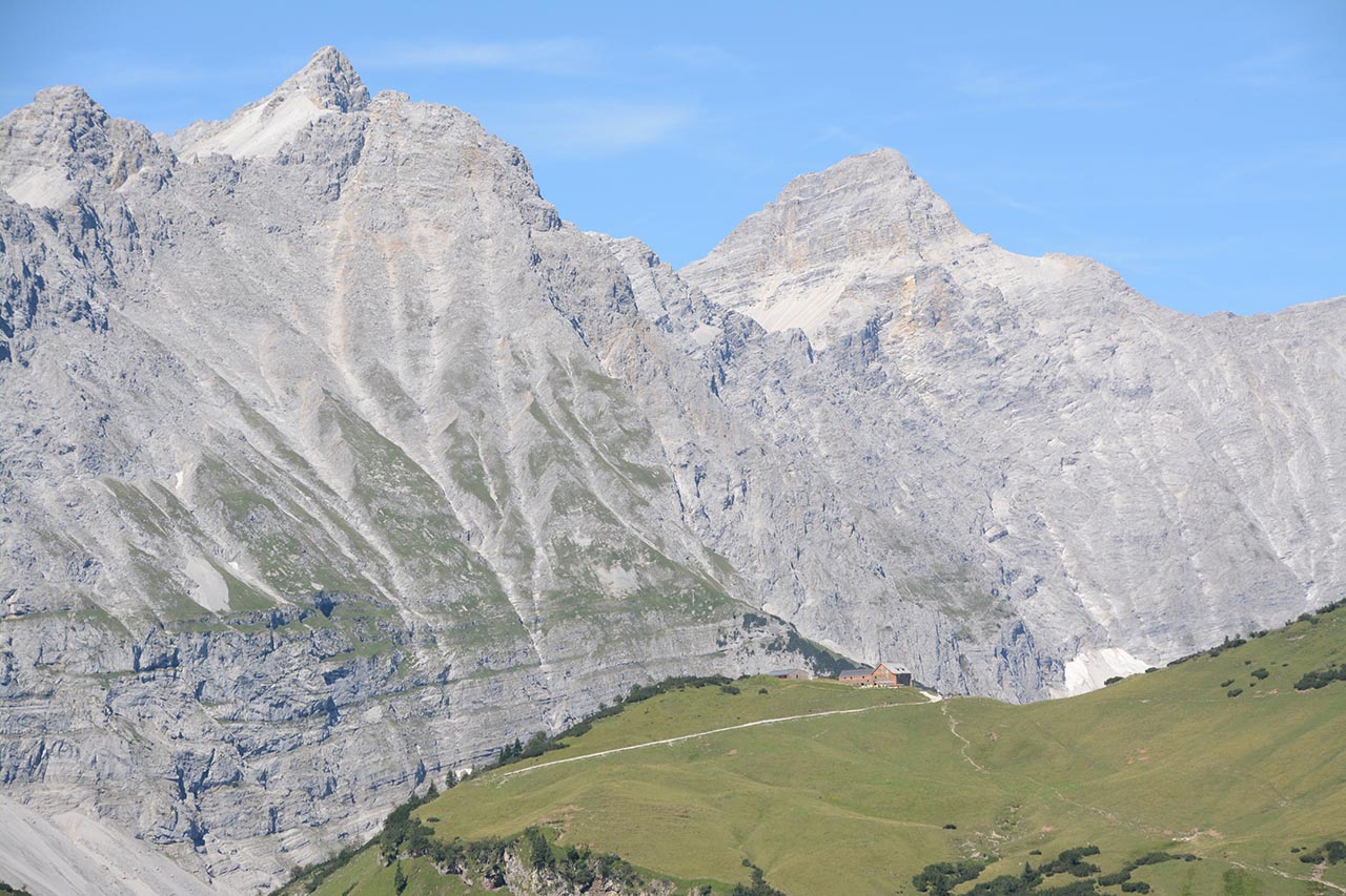 De route stijgt verder naar een pas. De kalkwand van de Birkkarspitze steekt nog een kilometer boven ons uit. Vanaf de pas (1803 meter) is het nog maar een kort stukje dalen tot de Karwendelhaus hut.