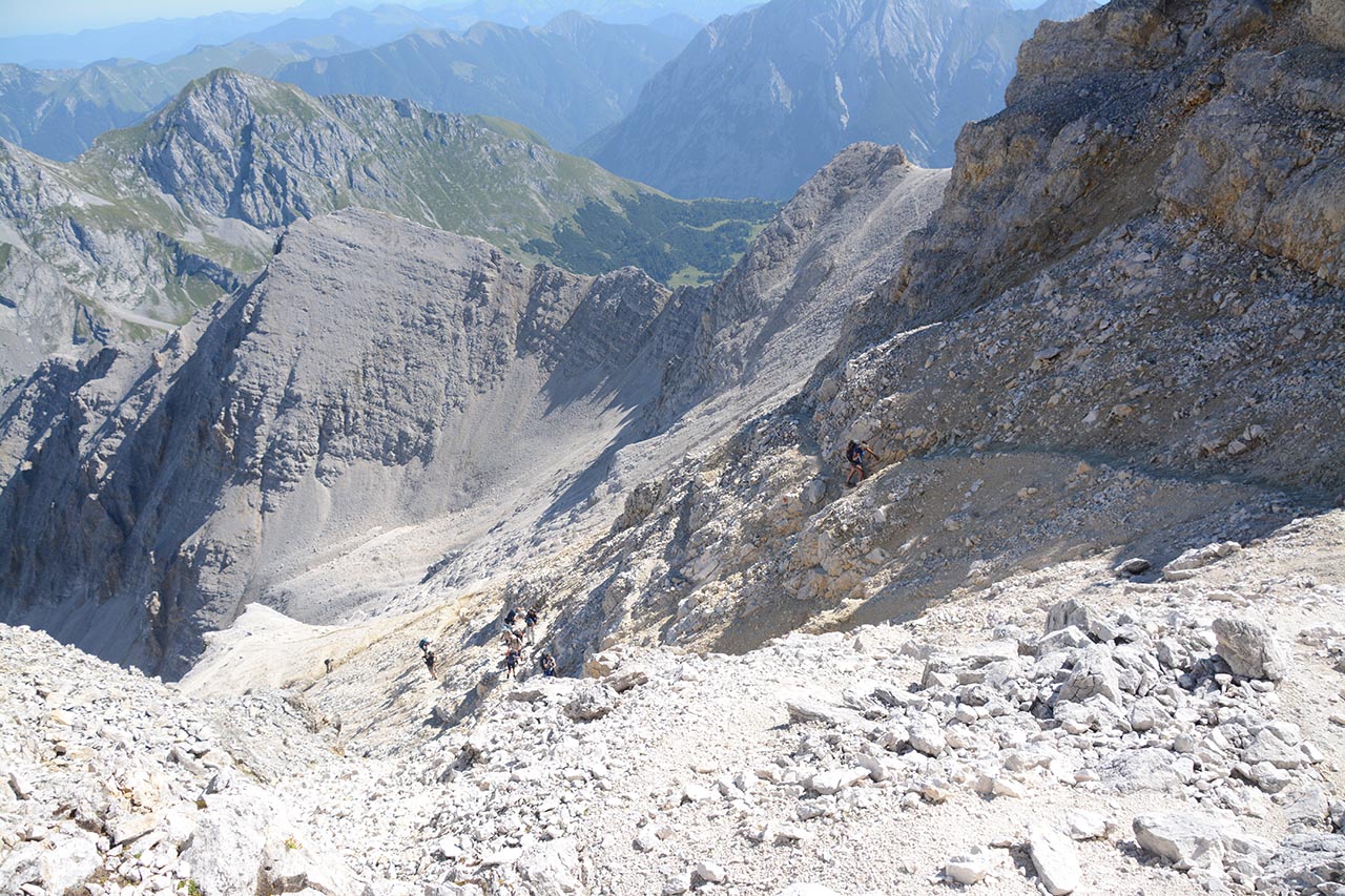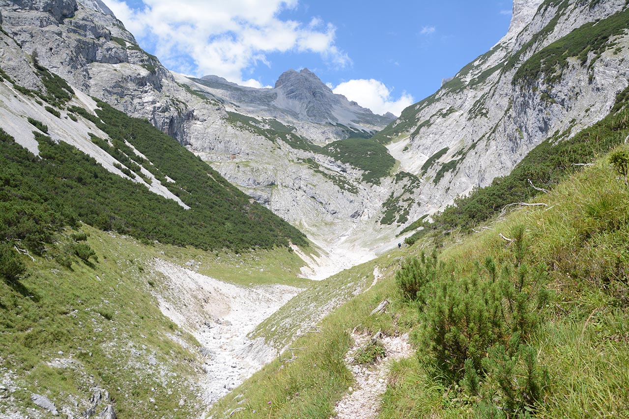 Het afdalen naar het Hinterautal duurt eindeloos. Na de puinhelling volgt er nog een. En dan nog een stuk tussen de struiken door, waarna er weer puin volgt.