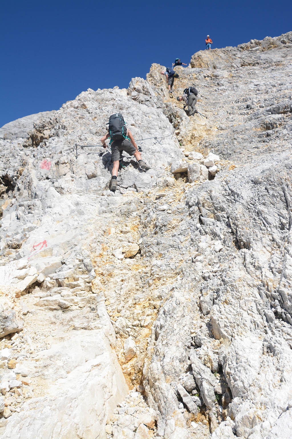 Er volgt een lang steil stuk over rotsen met een staalkabel. Erg leuk!