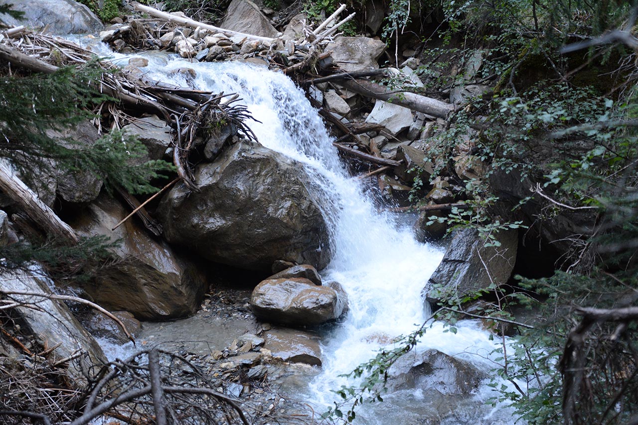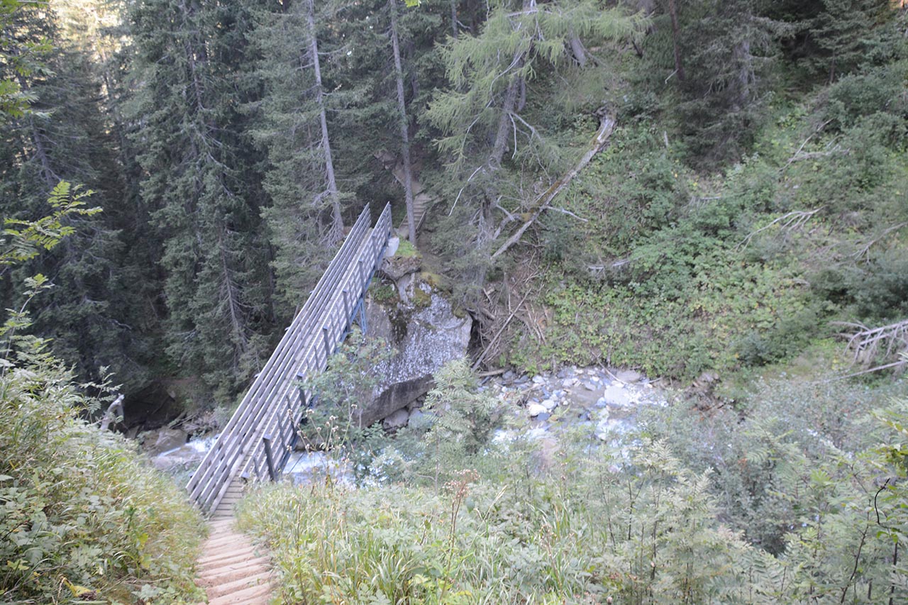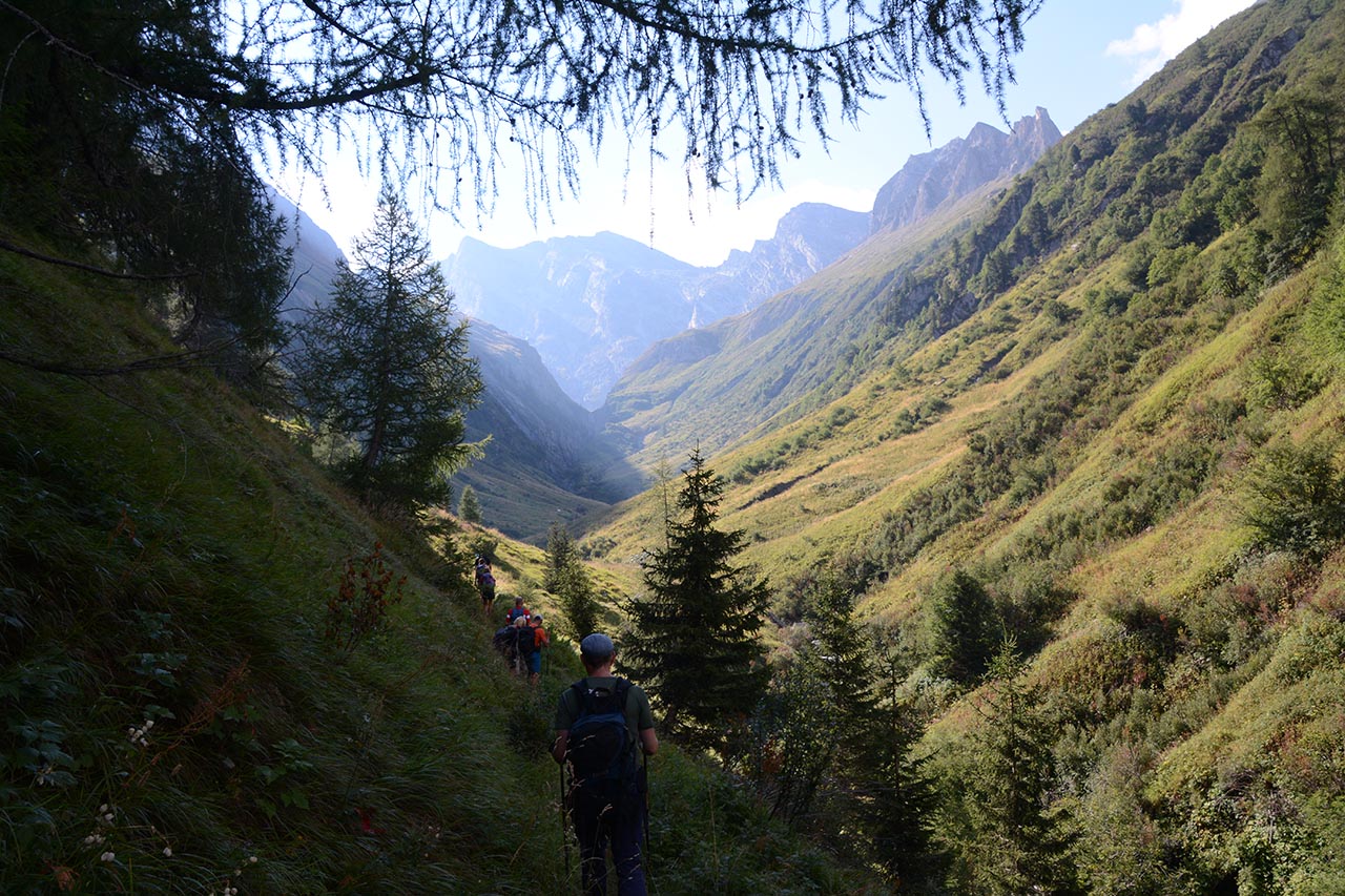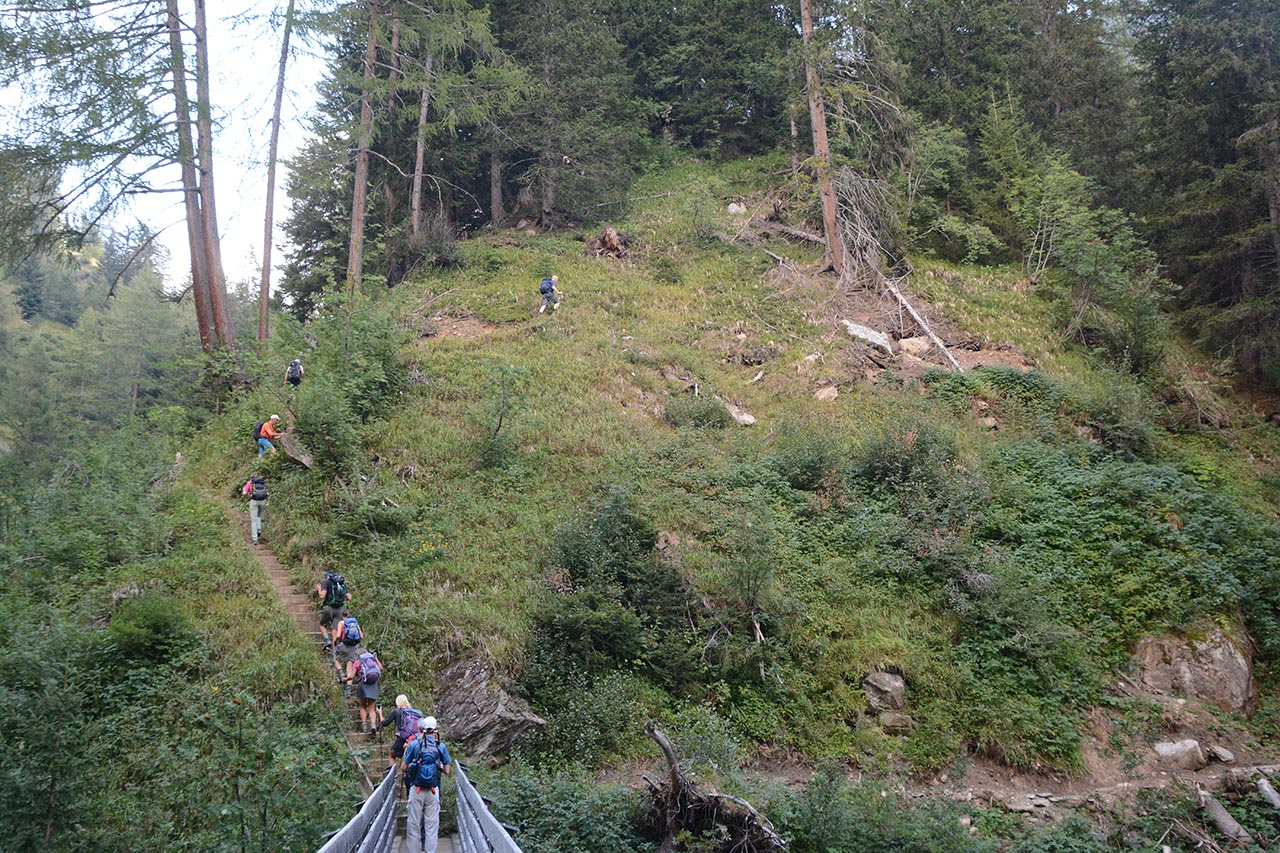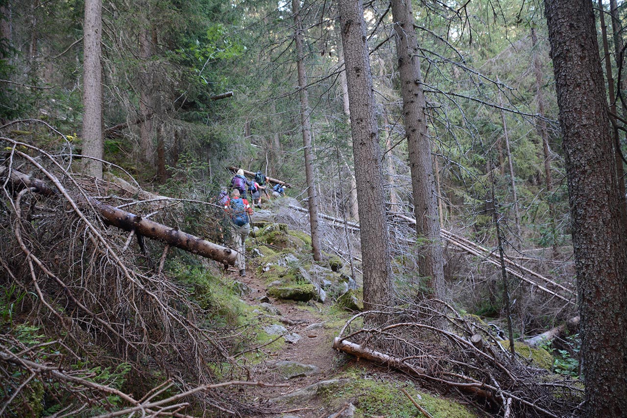 We vertrekken om 8:15 uit het Pfitschertal. Na een kort stukje over een dalende weg gaan we het bos in. Even gaat het