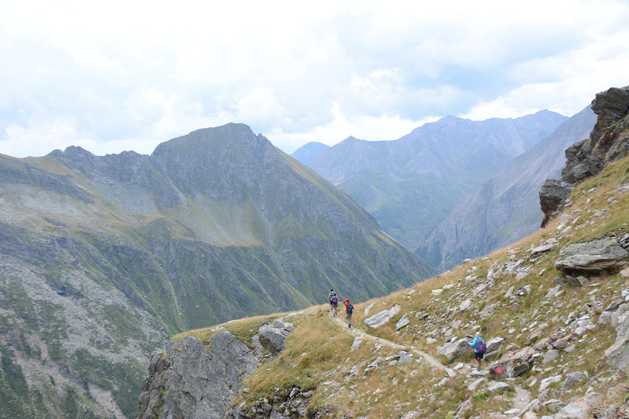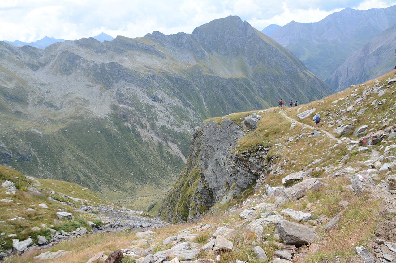 Er volgt een steile klim naar de scharte (Gliederscharte, 2644 m). Een koude wind blaast ons in de rug. Aan de andere kant