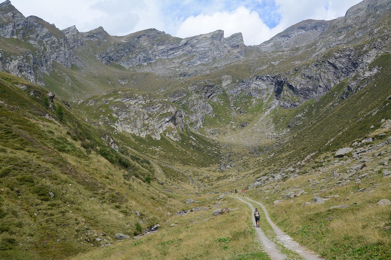 We steken een asfaltweg over en gaan verder in dezelfde richting. In het dal (Pfunderer Tal) liggen woningen en