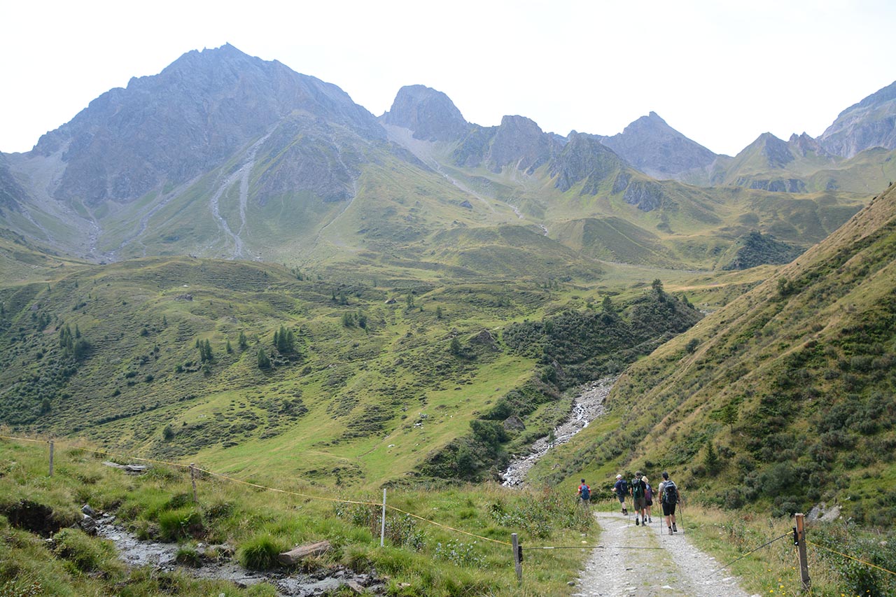Het steile stuk is gedaan. We lopen over een grindweg verder omlaag. Rechts van ons ligt een